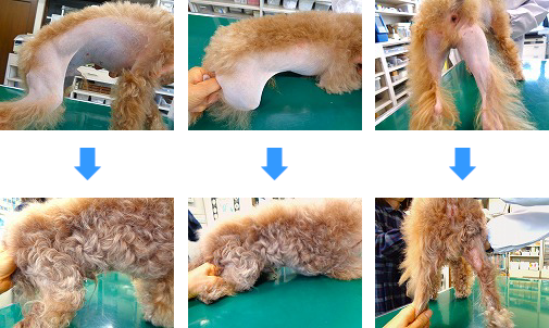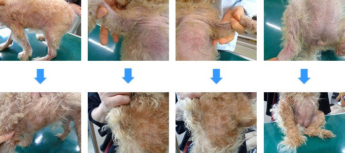 全身に痒みがあり、皮膚は赤く脱毛部分も多くありました。時々痒みも出ますが、徐々に毛量も増え、きれいな状態になりました。