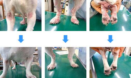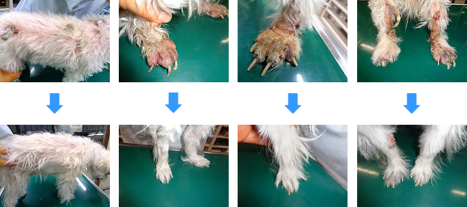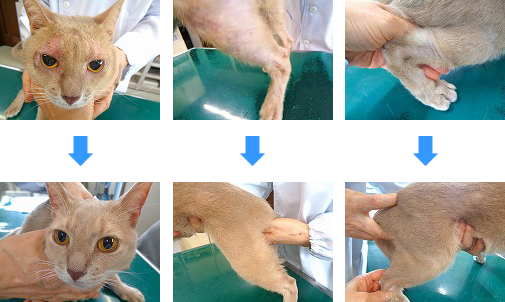 全身を長い時間舐めていたり、血が出るまで掻いたりの状態でした。薬は調整しながらですが、5か月後にはきれいな状態になりました。
