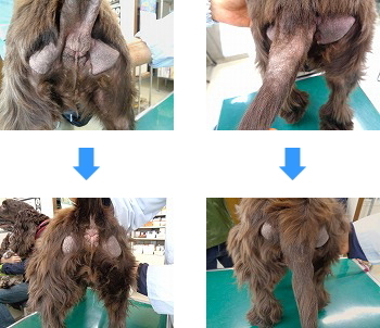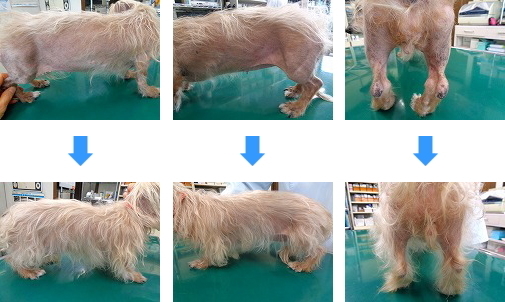 全身痒みがあり、皮膚はゴワゴワしていて毛も薄い状態でした。6か月後頃には、まだ痒みは多少ありますが、皮膚は柔らかくなり毛量も増えました。