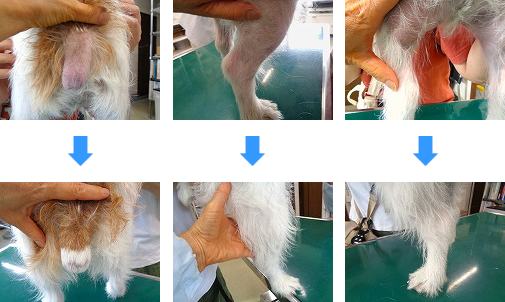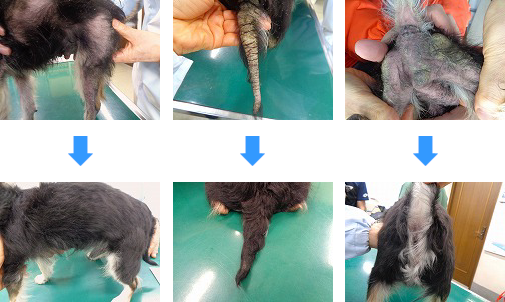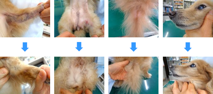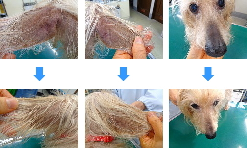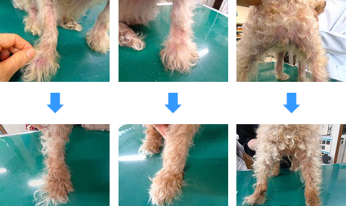 全身激しい痒みがあり、掻き傷で赤くなっていました。まだ薬の量は減らせませんが、3か月後には掻き傷は減り、毛も生えてきました。